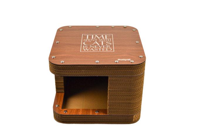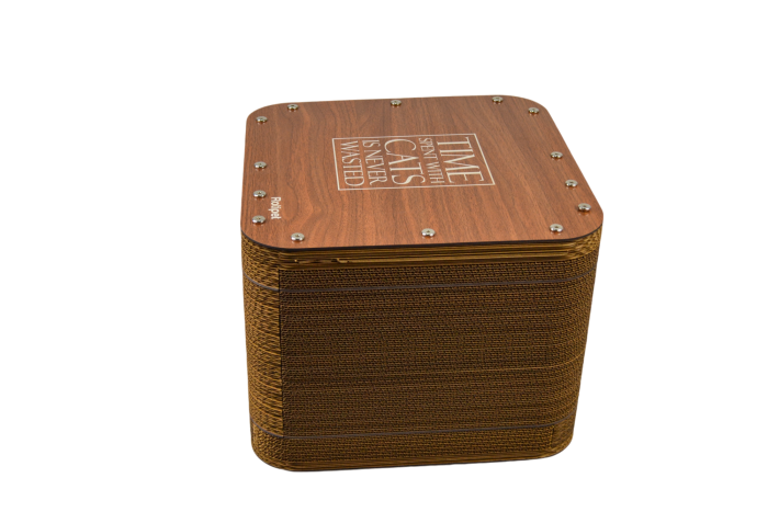Ονυχοδρόμιο γάτας από πεπιεσμένο χαρτόνι με χρωματιστά μέρη από MDF. Είναι ένα προϊόν που θα ικανοποιήσει το φυσικό ένστικτο της γάτας να ξύνει τα νύχια της. Δεν βλάπτει τα νύχια και τα πόδια τους. Χρησιμοποιήθηκαν ανακυκλωμένα υλικά και οργανική κόλλα. Προστατεύει τα έπιπλα και τα χαλιά σας.