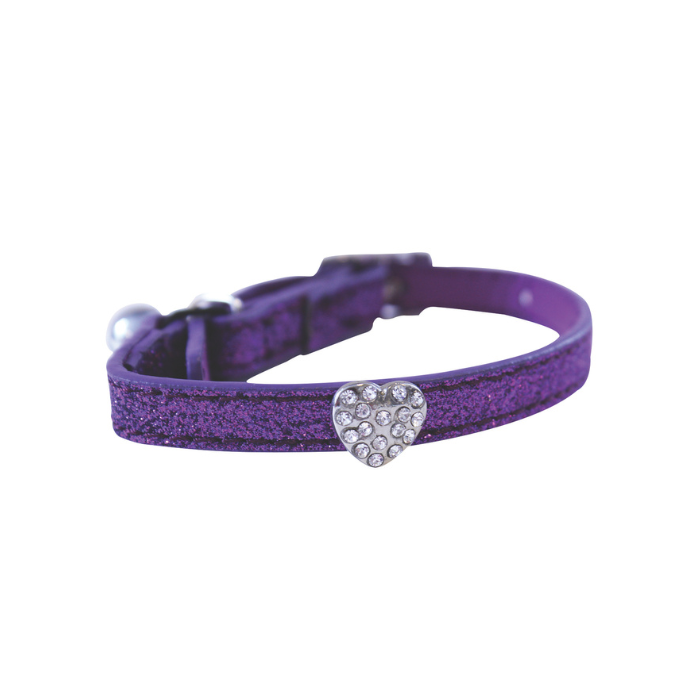 Μια σειρά από πολυτελείς, μοντέρνους λαιμοδέτες για γάτες με στυλ. Από συνθετικό δέρμα με γκλίτερ, διακοσμημένο με καρδιά από λαμπερές πέτρες και κουδουνάκι.