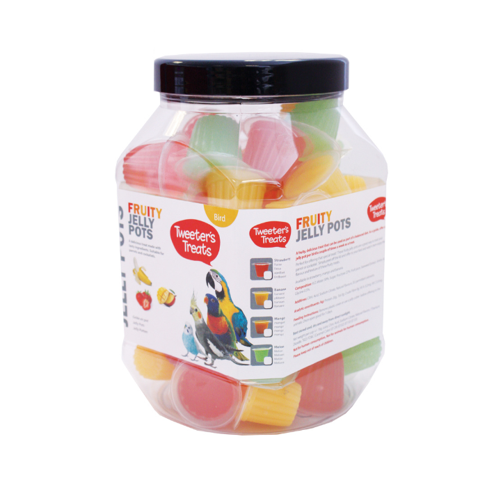 Κάθε δοχείο αποτελείται από 60 ζελεδάκια. Περιέχει ένα μίγμα από γεύσεις Φράουλας, Μανγκό και Μπανάνα που μπορούν να χρησιμοποιηθούν ως φρουτώδες, νόστιμο φαγητό ως μέρος μιας ισορροπημένης διατροφής. Απλά ξεφλουδίστε το καπάκι και τοποθετήστε το σε ένα πιάτο ή στο πάτωμα του κλωβού.