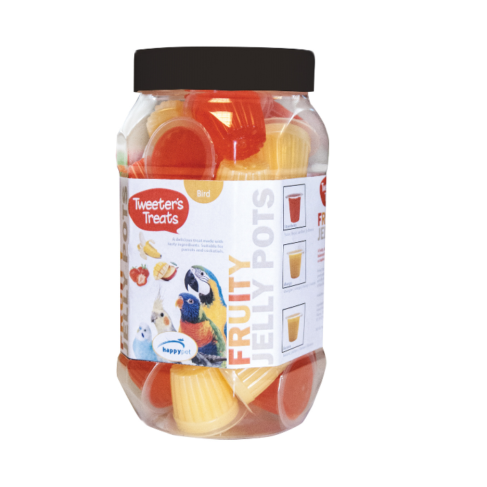 Κάθε δοχείο αποτελείται από 27 ζελεδάκια. Περιέχει ένα μίγμα από γεύσεις Φράουλας, Μανγκό και Μπανάνα που μπορούν να χρησιμοποιηθούν ως φρουτώδες, νόστιμο φαγητό ως μέρος μιας ισορροπημένης διατροφής. Απλά ξεφλουδίστε το καπάκι και τοποθετήστε το σε ένα πιάτο ή στο πάτωμα του κλωβού.